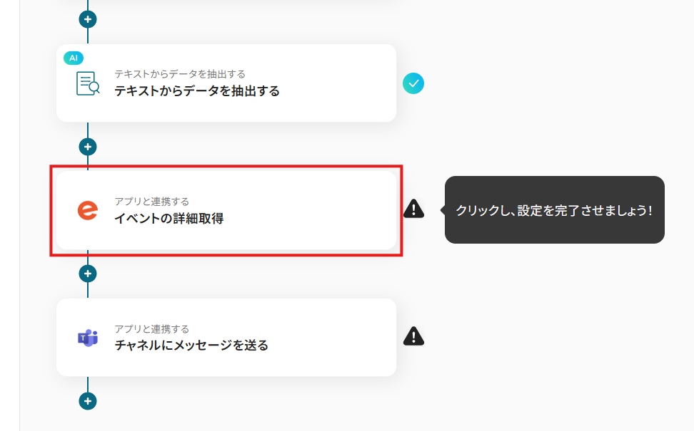 Eventbriteのトリガー設定では、通知の対象としたい組織IDを任意で設定できます AI機能では、トリガーで取得したイベント情報の中から、通知に必要なテキスト項目を自由に指定して抽出することが可能です 分岐機能では、イベントの種類やタイトルに含まれるキーワードなど、前段で取得した情報をもとに通知先を変えるといった条件を自由にカスタマイズできます Microsoft Teamsへの通知設定では、メッセージを送るチャネルを任意で設定でき、本文にはイベント名や日時など、前段で取得した情報を変数として埋め込めます ■注意事項