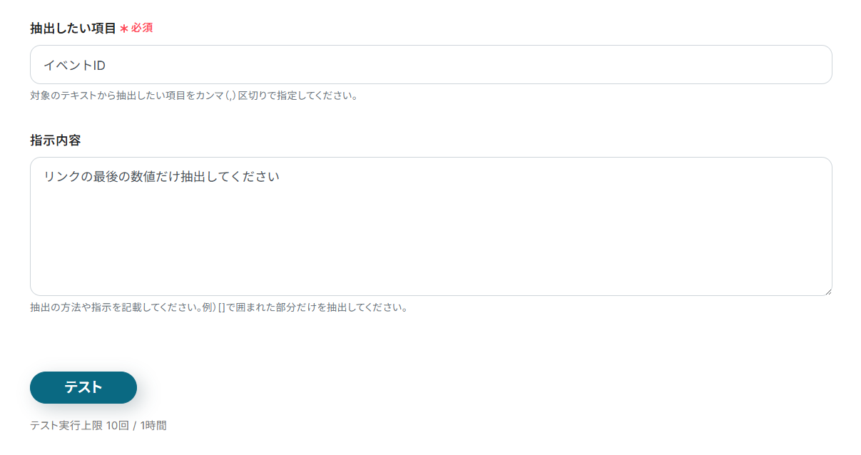 先ほど取得した値には詳細なイベントデータが含まれていないため、今後の設定で詳細なデータを取得できるよう、まずはEventbriteのイベントIDの取得を行います。イベントIDはトリガーアクションで取得した「API URL」の末尾に記載されているため、AI機能によってIDだけを抽出していきましょう。