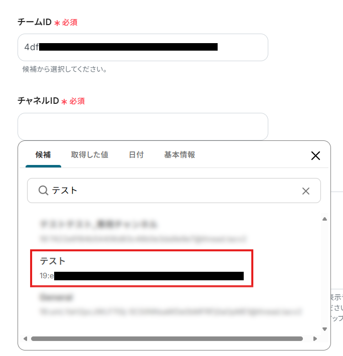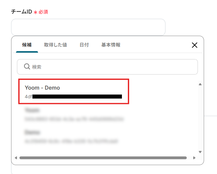 「チームID」にメッセージを送るチャネルが属しているチームのIDを設定。 入力欄をクリックすると、連携しているアカウントから候補が表示されるため、対象となるチームを選択してください。