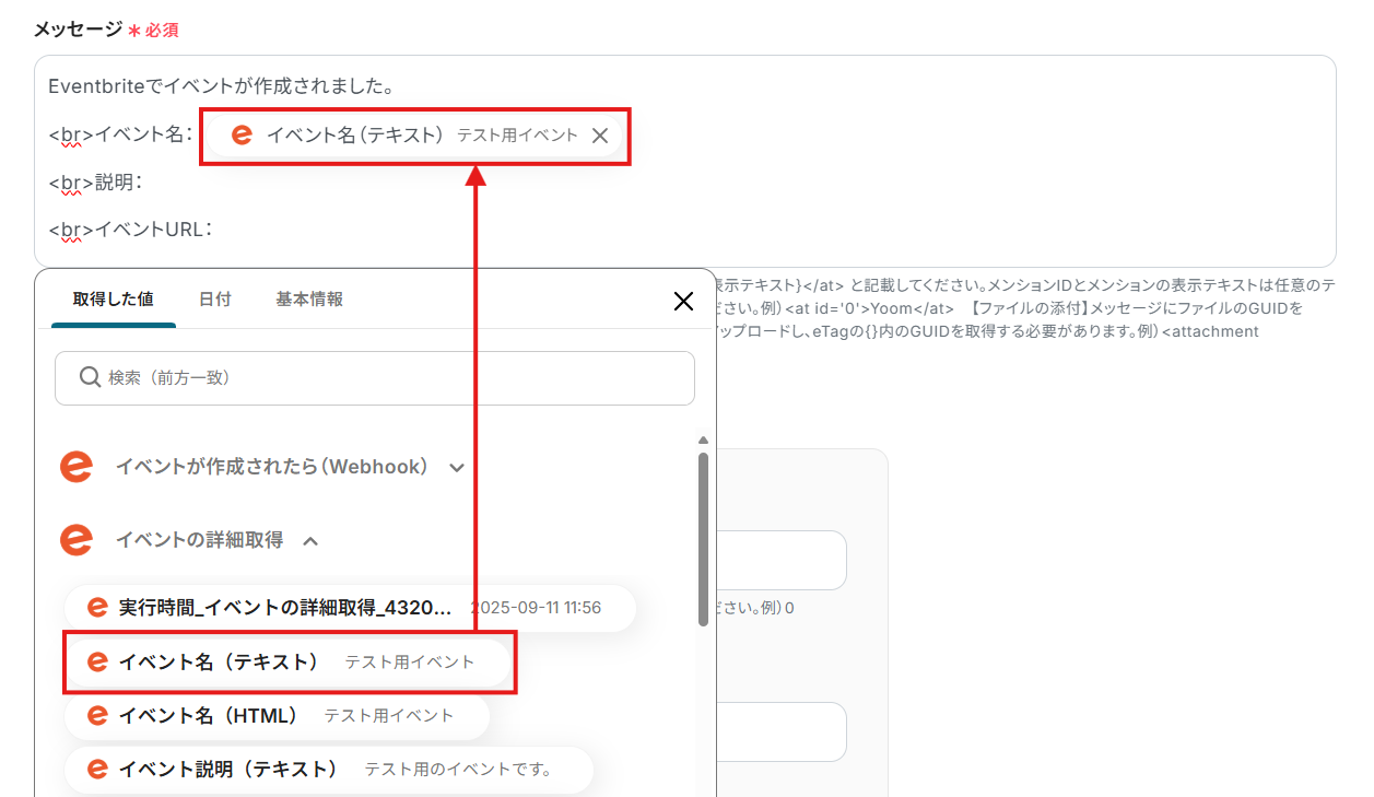 「メッセージ」にメッセージの内容を設定。 画像のように取得した値 を活用することで最新のデータをその都度Microsoft Teamsへ自動送信可能となります。な お、テキストを直接入力した部分は固定値とされるため、下記画像のように「Eventbriteでイベントが作成されました」などは手入力し、毎回変動することが望ましい「イベント名(テキスト)」などは取得した値を活用しましょう。