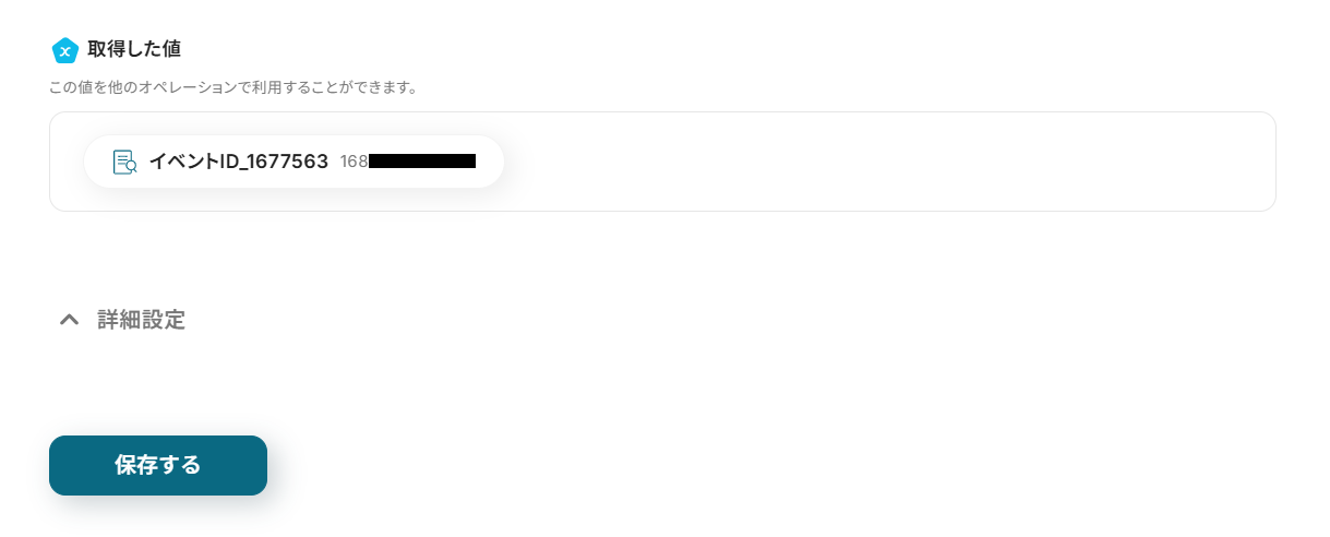 テストに成功すると、作成したイベントのIDやURLなどが「取得した値」に追加されます。 これらの値は、以降のアクションで動的な値(フローが稼働する度に更新される値 )として使用可能です。 詳しい説明は、こちらのヘルプページ をご覧ください。
