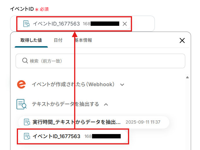 「イベントID」にはデフォルトで、ステップ4で抽出した値が設定されています。 削除してしまった場合には、入力欄クリック時に表示されるデータ抽出アクションメニューから「イベントID」を選択してください。