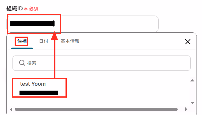 「組織ID」は連携しているEventbriteから候補が表示されるため、任意のものを選んでクリックします。