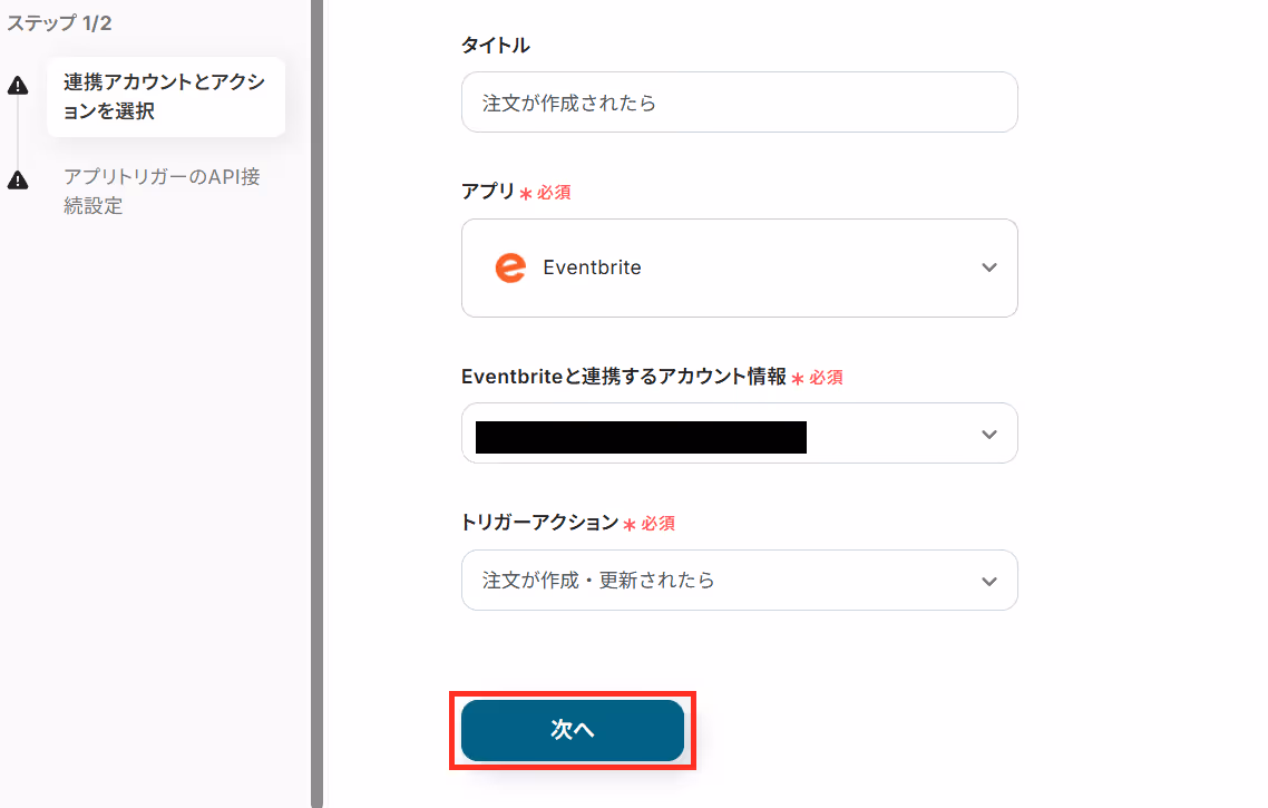 まずはタイトルを任意で設定し、Eventbriteと連携するアカウントやアクション内容を確認したら「次へ」を押してください。