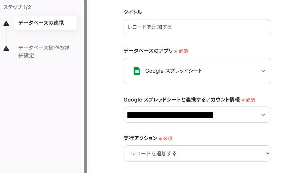 まずはタイトルは任意で設定し、Google スプレッドシートと連携するアカウントやアクション内容を確認してください。