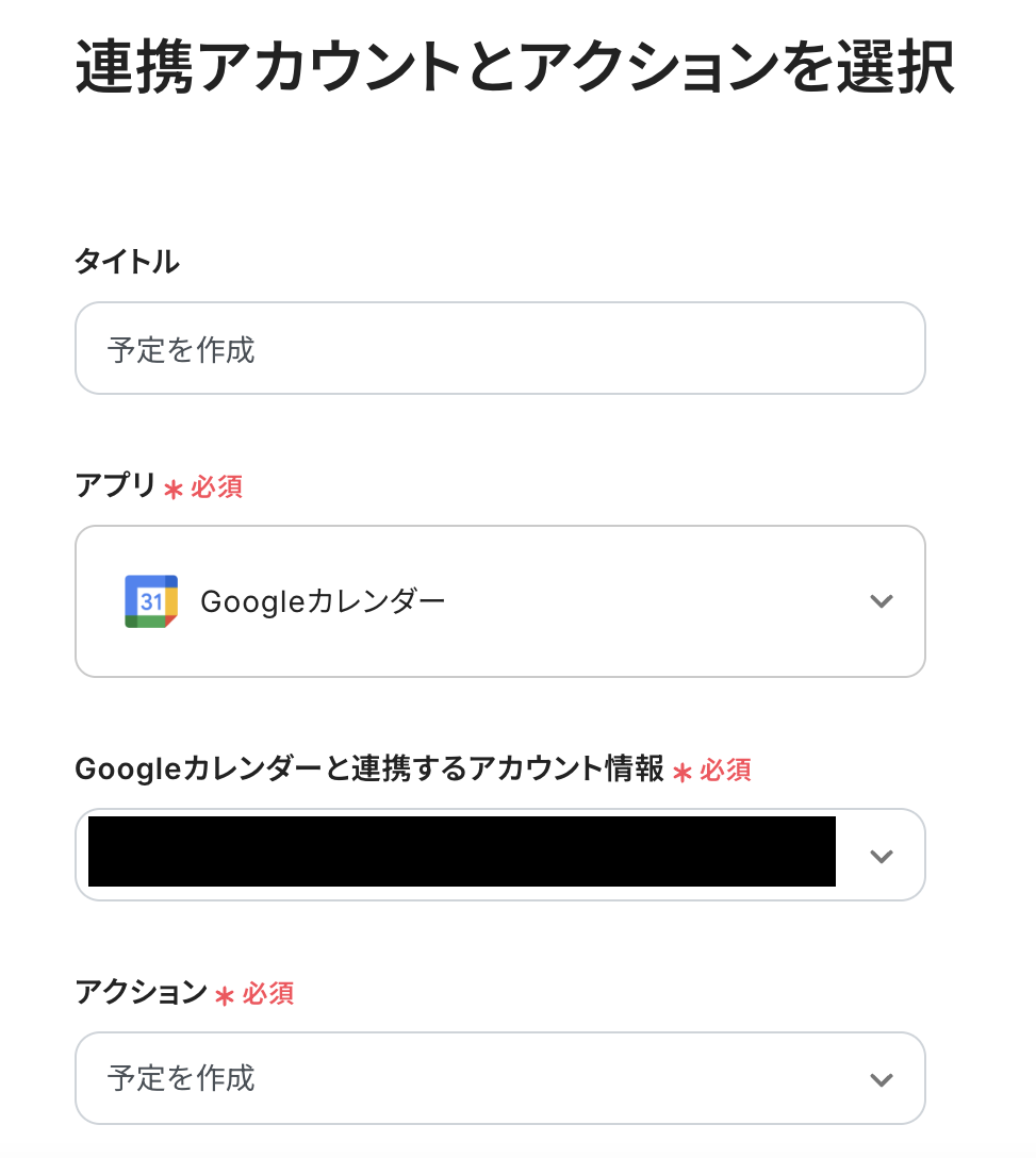 必要箇所を入力していきます。 「タイトル」:必要に応じて変更可能 「Googleカレンダーと連携するアカウント情報」:合っているか確認 「アクション」:「予定を作成」を選択