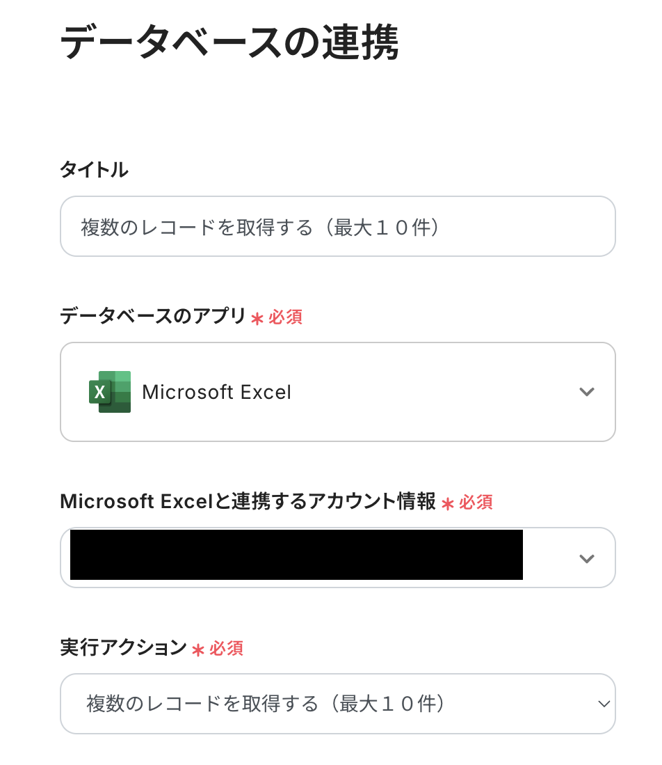 まずは、必要箇所を入力していきます。 「タイトル」:必要に応じて変更可能 「Microsoft Excelと連携するアカウント情報」:合っているか確認 「実行アクション」:「複数のレコードを取得する(最大10件)」を選択