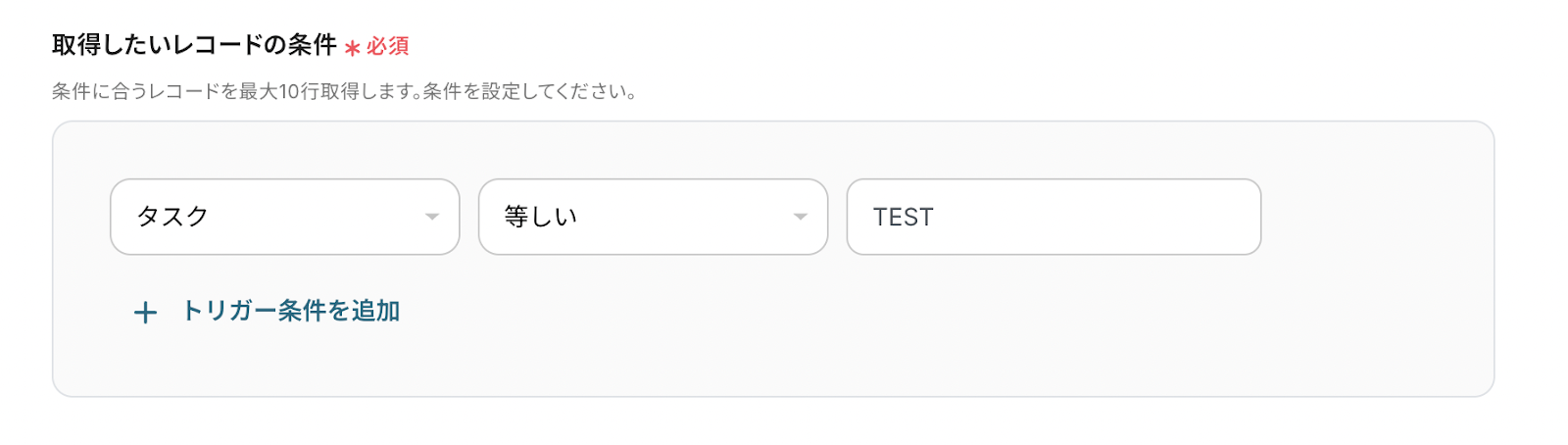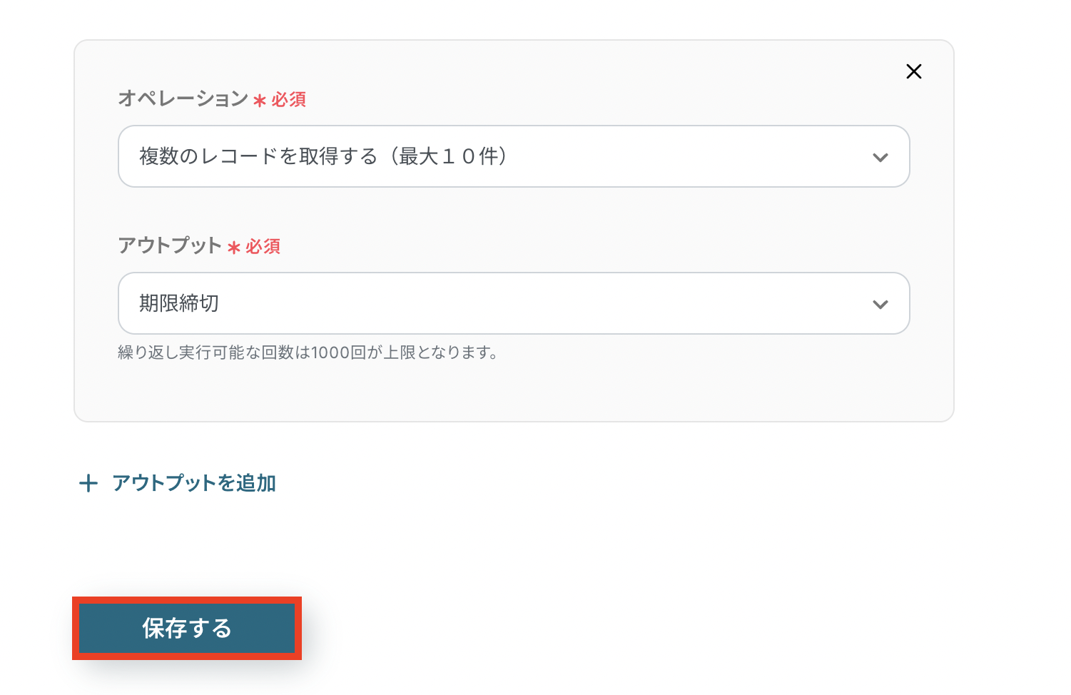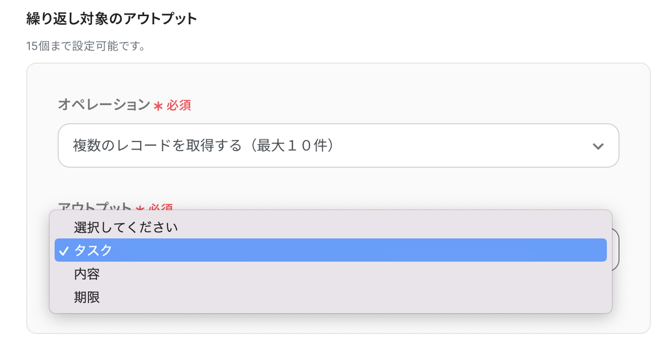 作成方法は簡単です! 「オペレーション」:「複数のレコードを取得する(最大10件)」を選択 「アウトプット」:「タスク」を選択