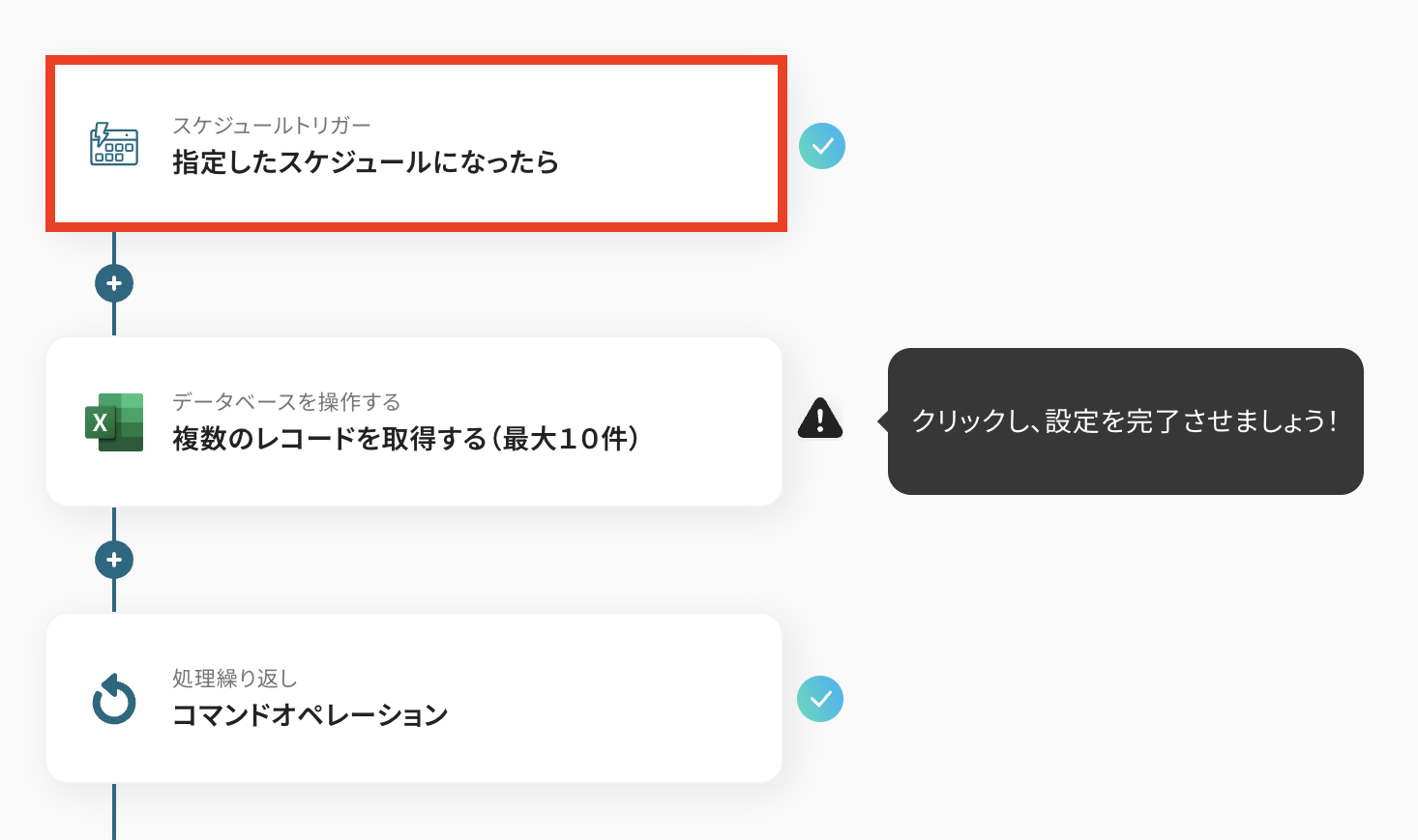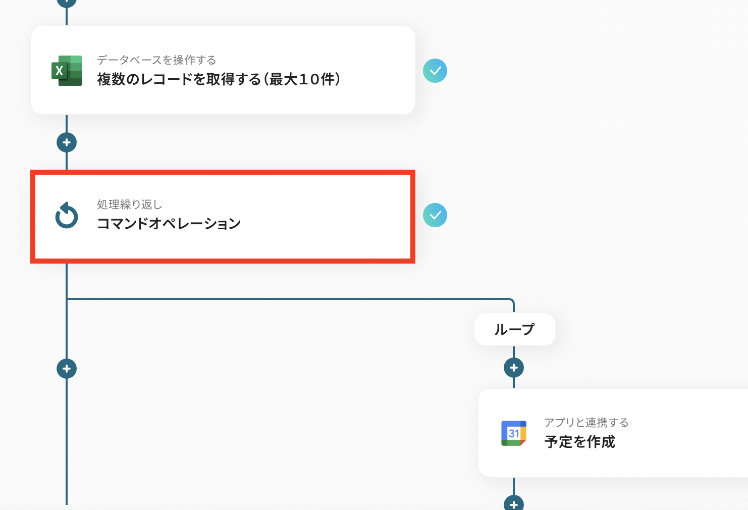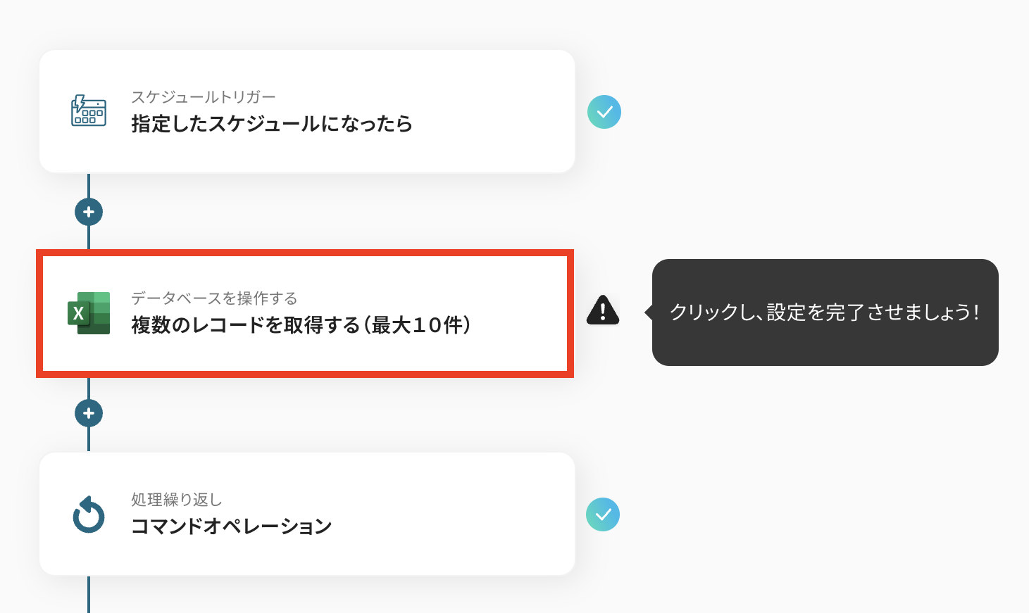 作成方法は簡単です! 「オペレーション」:「複数のレコードを取得する(最大10件)」を選択 「アウトプット」:「タスク」を選択