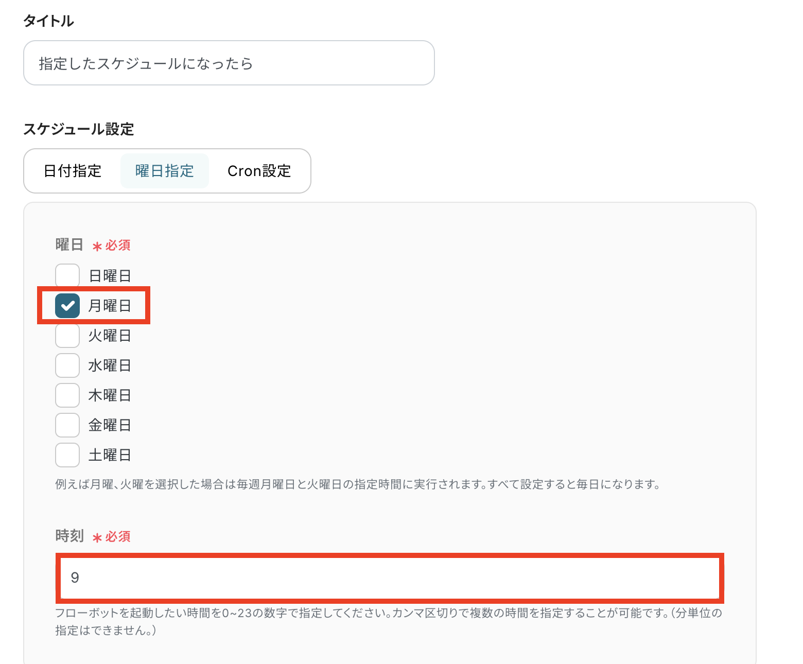 フローボットを起動したいタイミングを設定します。 テンプレートでは「毎週月曜日9時」にフローボットが起動される設定となっています。 曜日や通知の時間は必要に応じて変更してください。 設定を確認したら「保存する」をクリックします。 ※「Cronの設定」では、曜日によって別の時間帯に起動したいなどの細かな設定が可能です。 ※設定の詳しい設定方法はこちら をご確認ください。