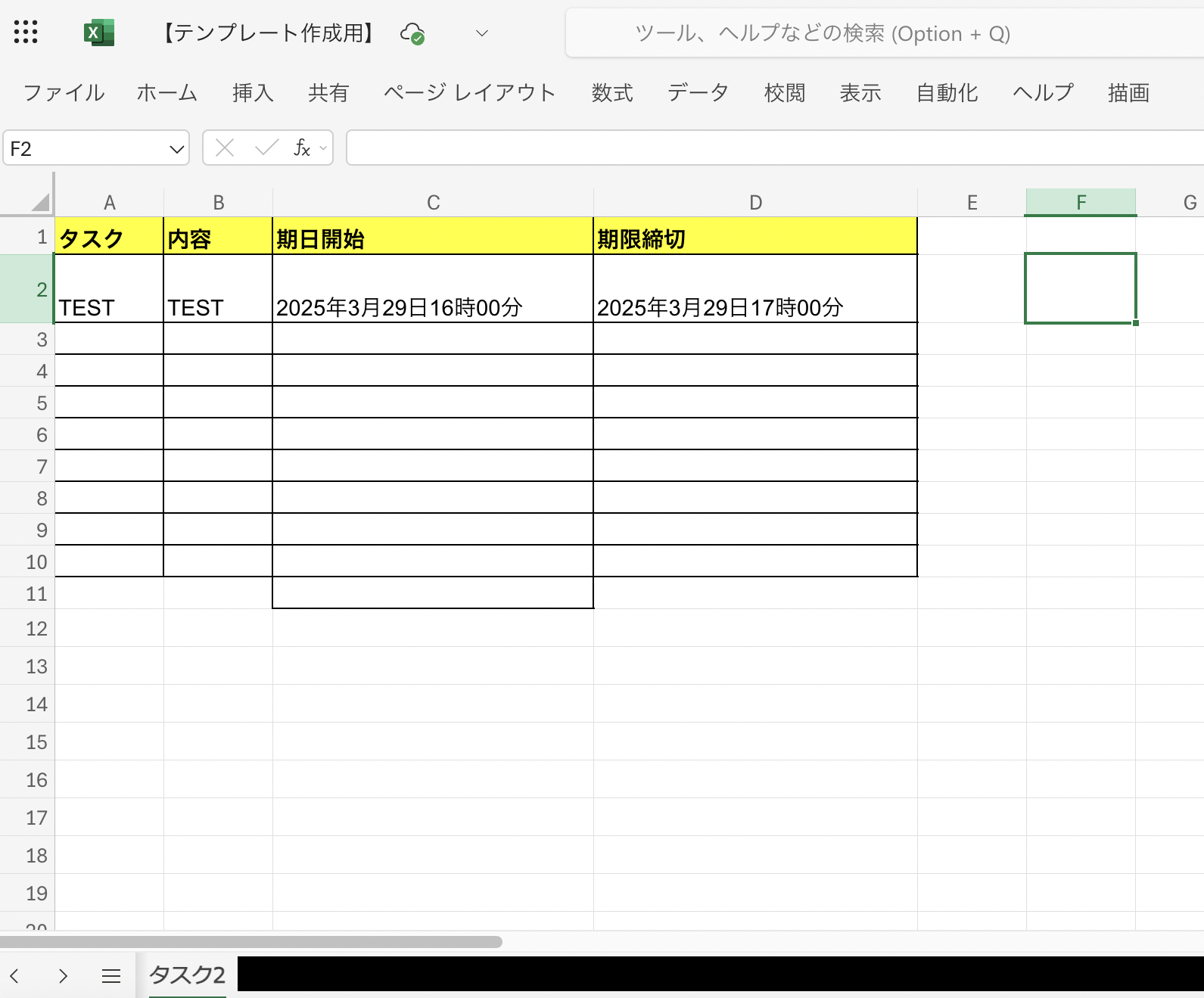 次に「連携するMicrosoft Excelのシート情報」をしていきます。 今回はテスト用として、タスク管理シート(シート名:タスク2)を作成しました。