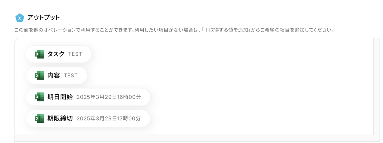 ここでは、Googleカレンダーに反映させたいMicrosoft Excelシートの「タスク」「内容」「期日開始」「期限締切」の4つについてアウトプットを作成します。 ※「同じ処理を繰り返す」の詳しい設定方法についてはこちら をご確認ください。 ※「同じ処理を繰り返す」オペレーション間の操作は、チームプラン・サクセスプランでのみ利用できる機能です。フリープラン・ミニプランの場合は設定しているフローボットのオペレーションやデータコネクトはエラーとなるため、ご注意ください。 ※チームプランやサクセスプランなどの有料プランは、2週間の無料トライアルを行うことが可能です。無料トライアル中には制限対象のアプリや機能(オペレーション)を使用することがで着るので、この機会にぜひ試してみてくださいね!