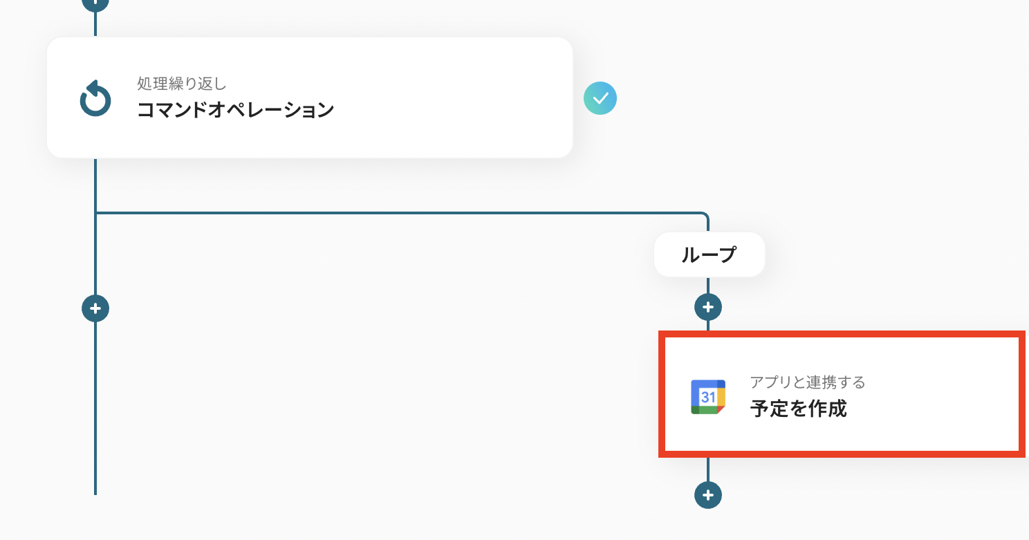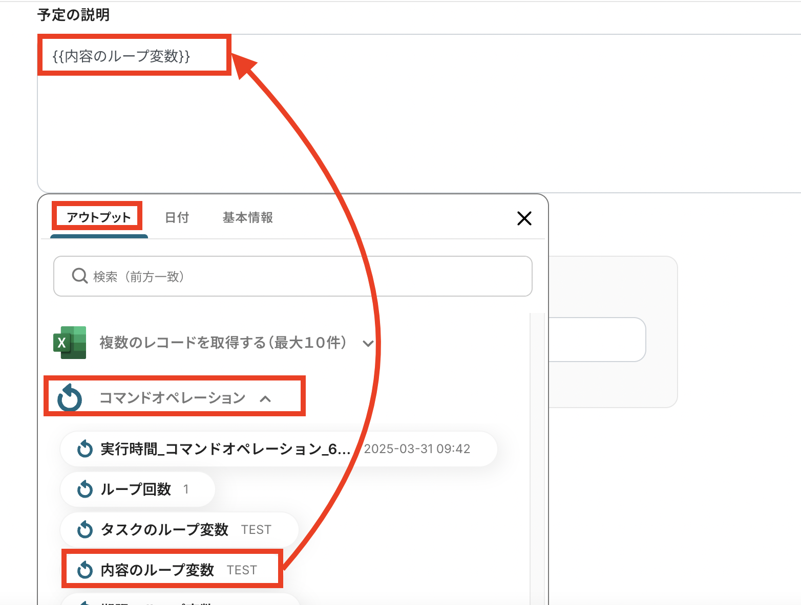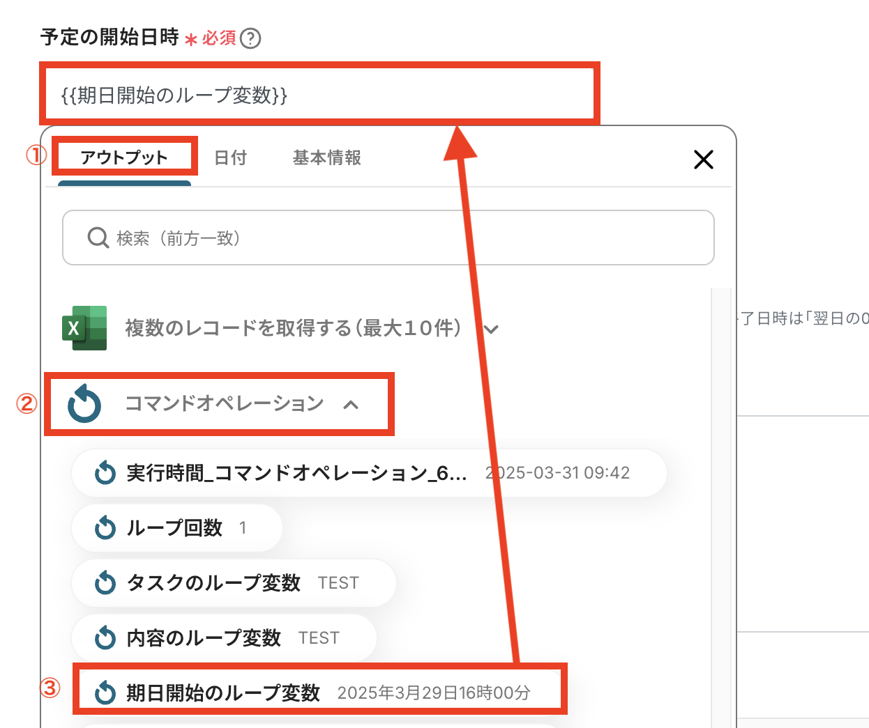 次に「予定のタイトル」を入力します。 ステップ5で取得したアウトプットを活用して入力しましょう。 ①入力欄をクリックして「アウトプット」を表示 ②「コマンドオペレーション」をクリック ③「タスクのループ変数」を選択