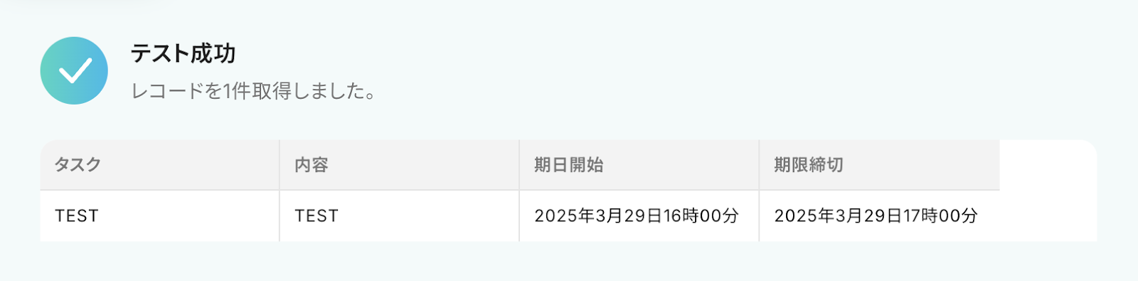 入力後「テスト」を押して、テストに成功すると画像のようにMicrosoft Excelの指定したテーブルのレコードが表示されます。
