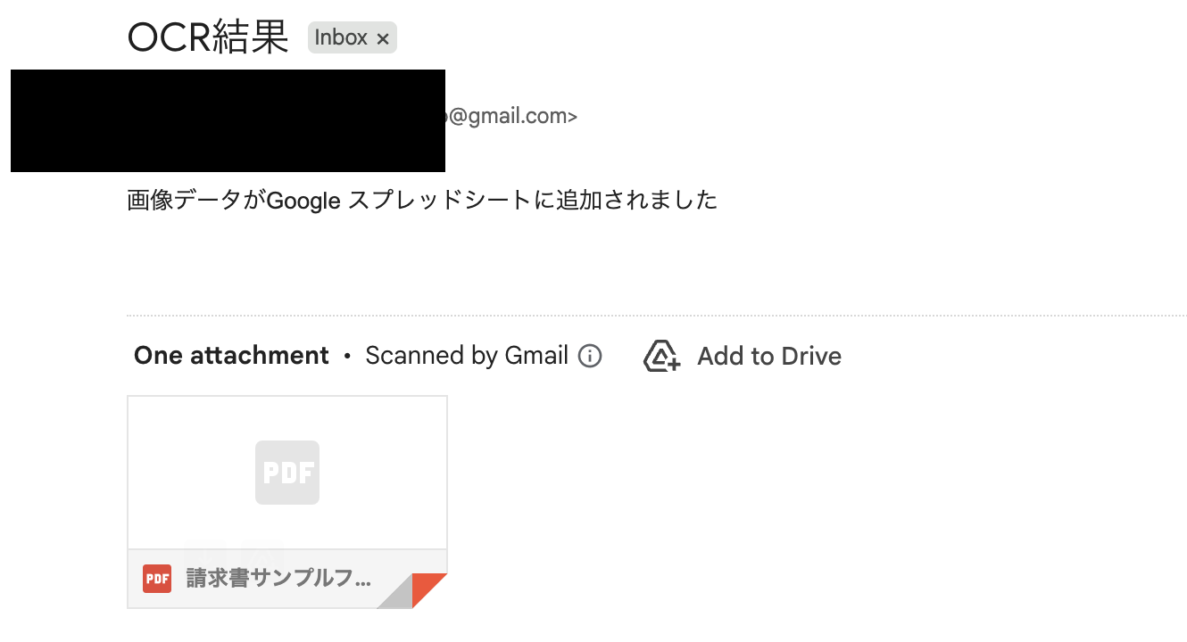 Gmailで受け取った請求書や契約書、名刺などの画像ファイルからテキスト情報を自動で読み取り、Google スプレッドシートに転記・保存できます。