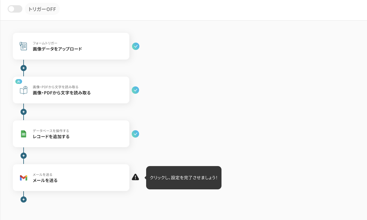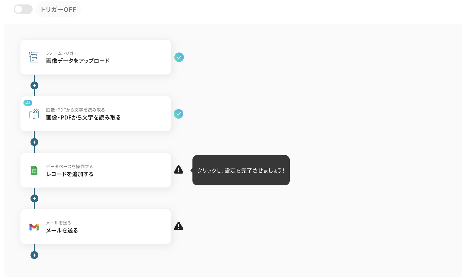 - フォームトリガーと各アクション(OCR(データ読み取り機能)、Google スプレッドシート、Gmail)の設定
