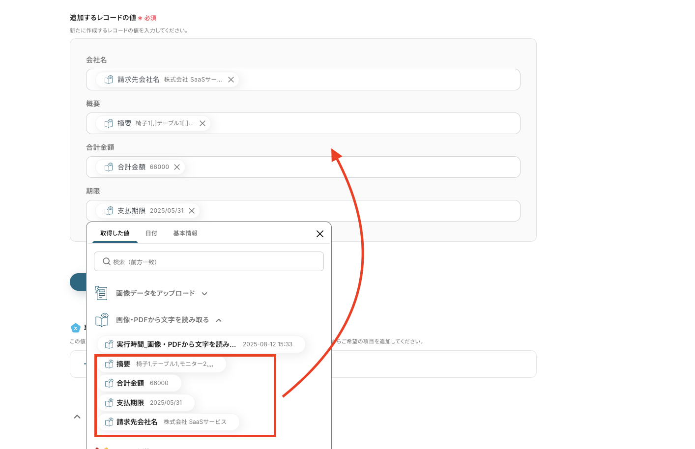 次の画面で追加するレコードの値は、以下の画面のように、入力バーをクリックすると前ステップから取得したアウトプットを引用できます。