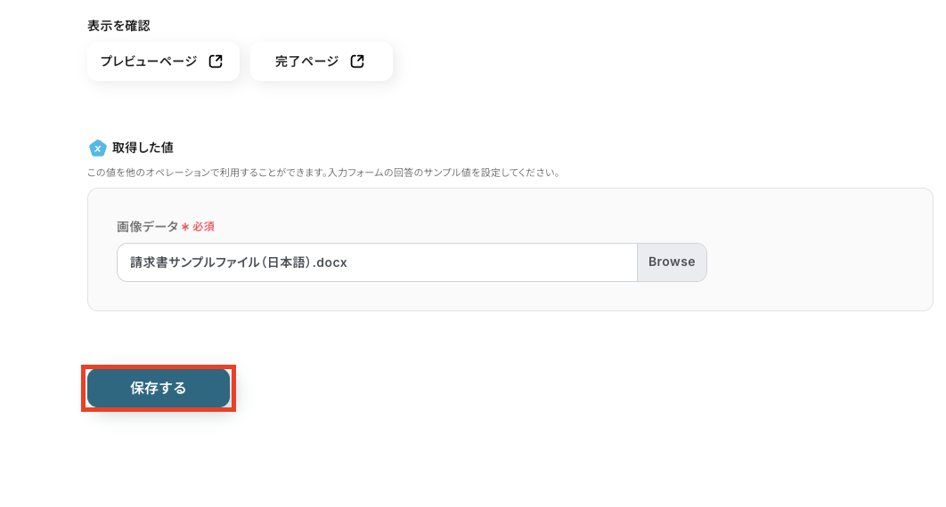 次の画面で、テストとして回答内容のサンプルデータをアップロードして、[保存する]をクリックしてください。