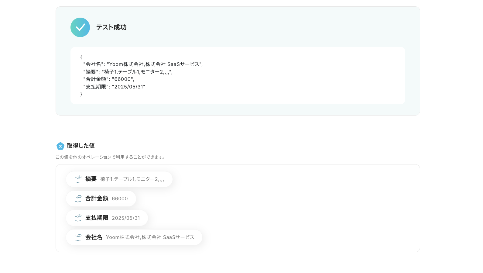 ※YoomのOCR機能では、アクション記載の規定の文字数を超えるデータや、文字が小さすぎる場合に正しく読み取れないことがあります。文字数や文字の大きさには少し余裕を持たせてご利用ください。
