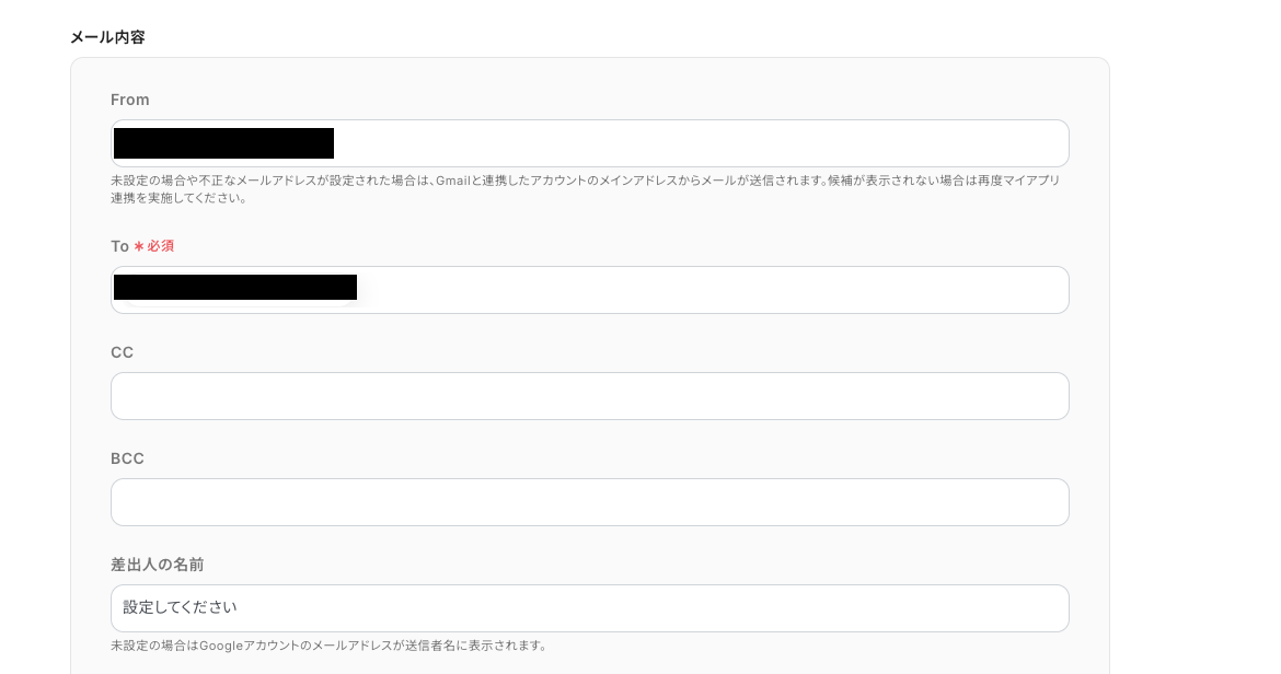 下にスクロールし、メールを送付する際の「メール内容」の設定を行います。通知先のアドレスやメッセージ本文などを設定しましょう。