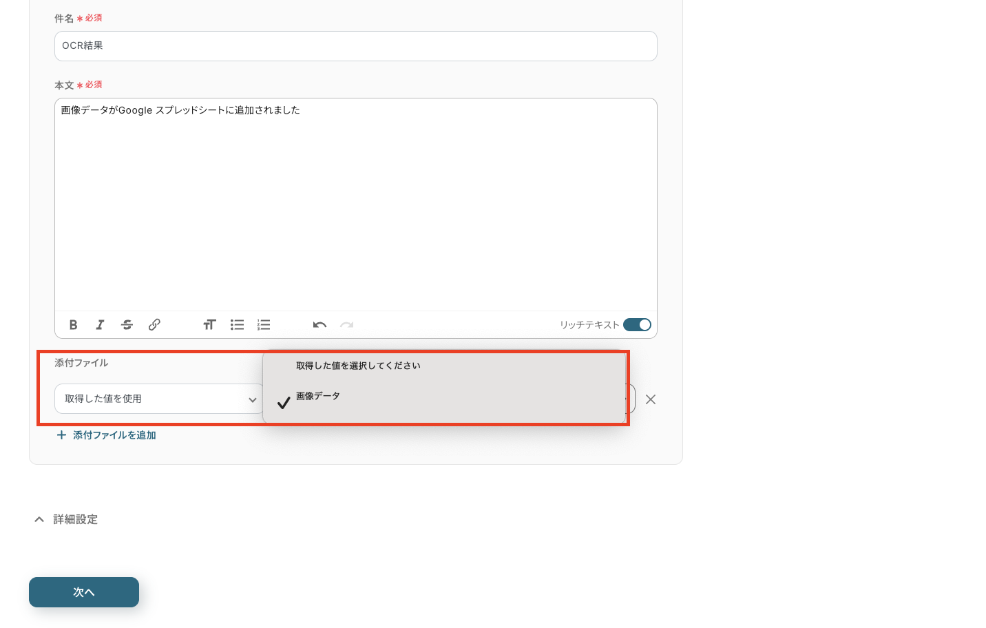 「ファイルの添付方法」は、以下のように【取得した値を使用】を選択し、フォームで受け取った画像データを参照するように設定します。
