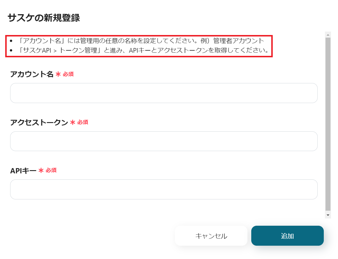 必須項目を埋めた後、右下の追加ボタンを押せば、サスケとYoomの連携も完了しました!