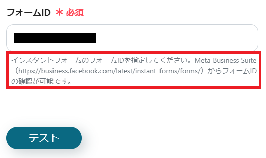 Facebook広告からリード情報をテスト送信し、フォームIDを入力しましょう。