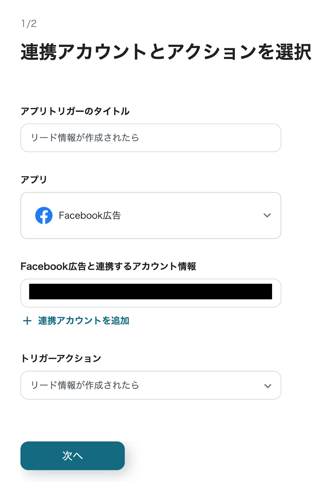 1ページ目にはFacebook広告同様に、連携したアカウント情報が反映されていますので確認して「次へ」を押してください。