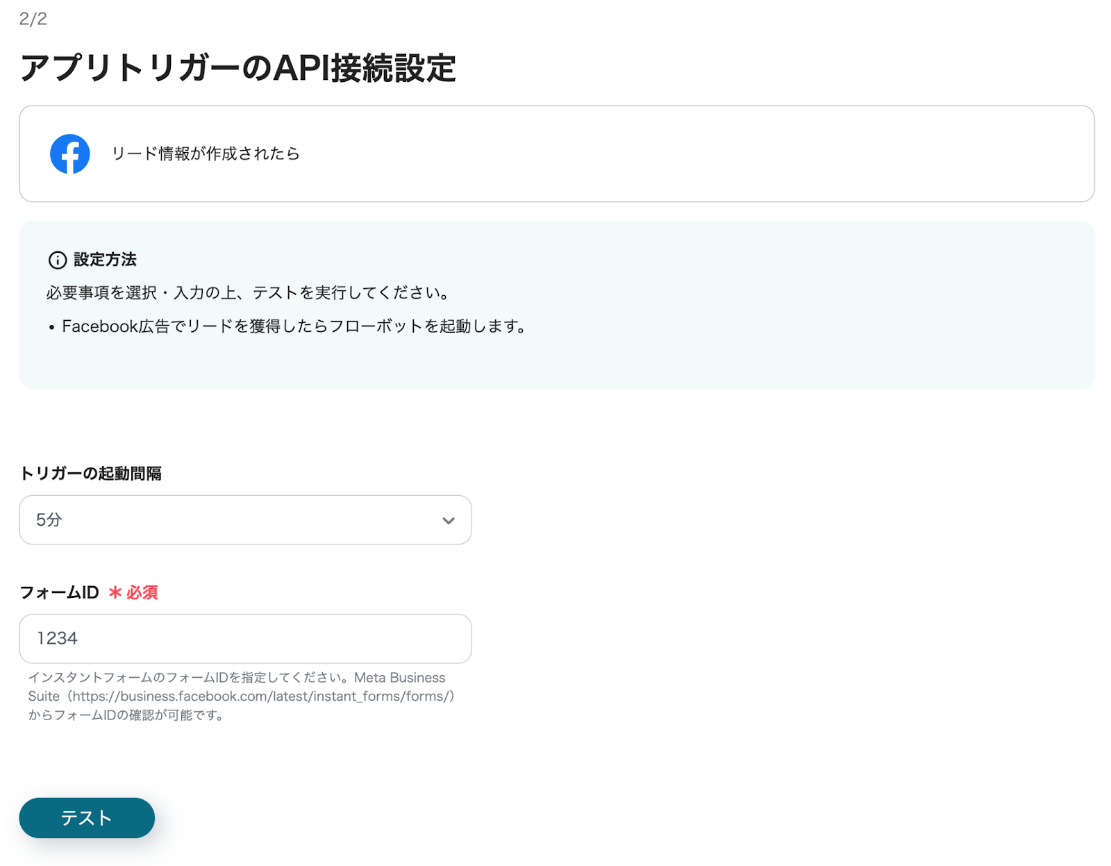 それぞれ必要な情報を入力できたら「テスト」ボタンを押します。