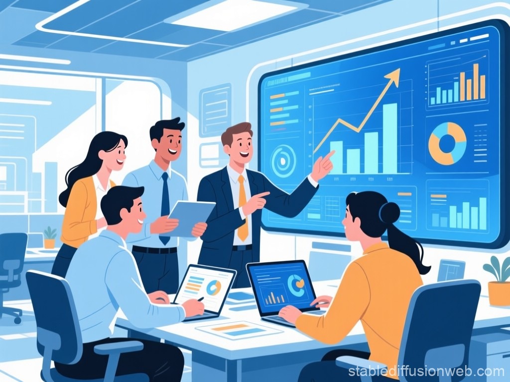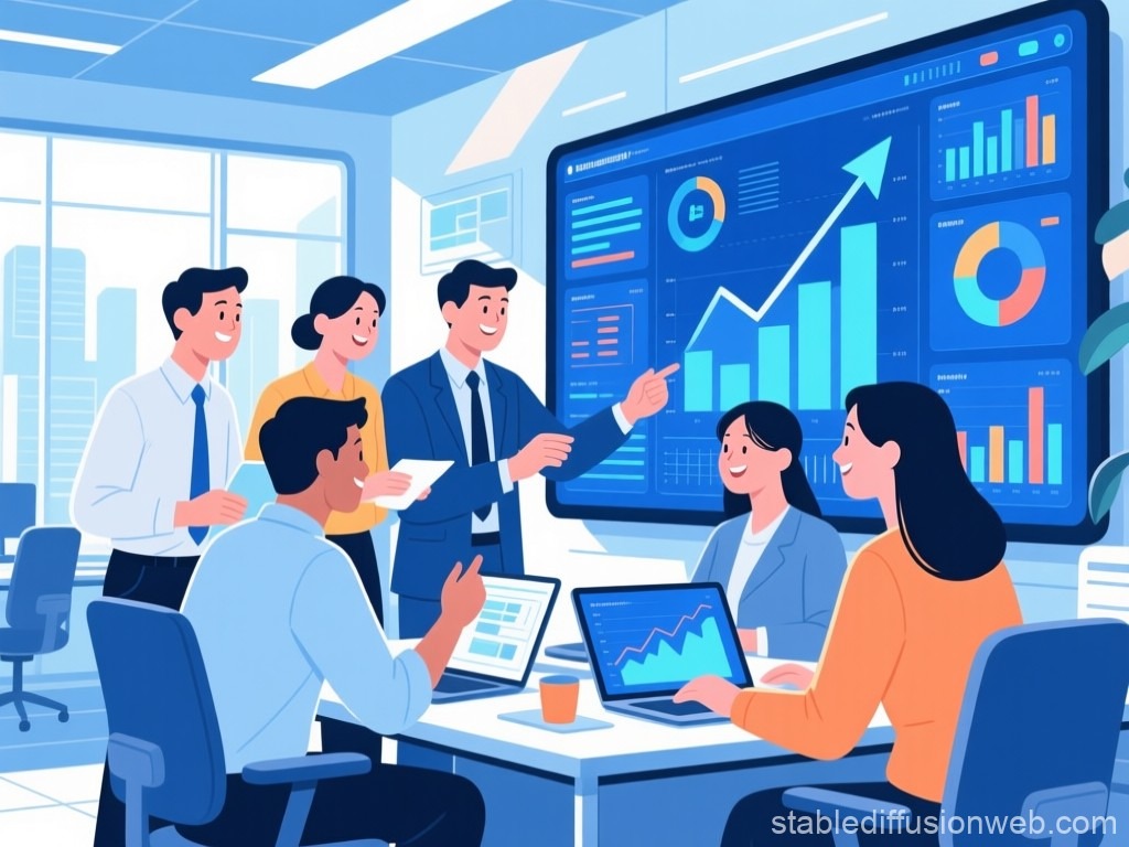 近未来的なオフィスで、チームが協力して画面上のデータを分析している様子。明るくポジティブな雰囲気で、ビジネスの成長を表現。イラスト調で。