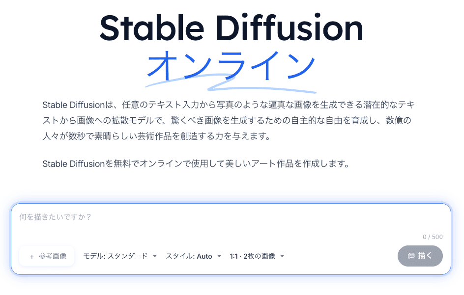 なお、Stable Diffusionを無料で使えるサービスはいくつか提供されていますが、ここでは「すぐに」「手軽に」 という理由から、ブラウザで使えるStable Diffusion Onlineを選んでいます。