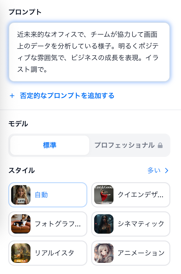 また、画像はプロンプトの意図を汲んだ「チーム」「データ分析」「ポジティブな雰囲気」といった要素を表現しています。
