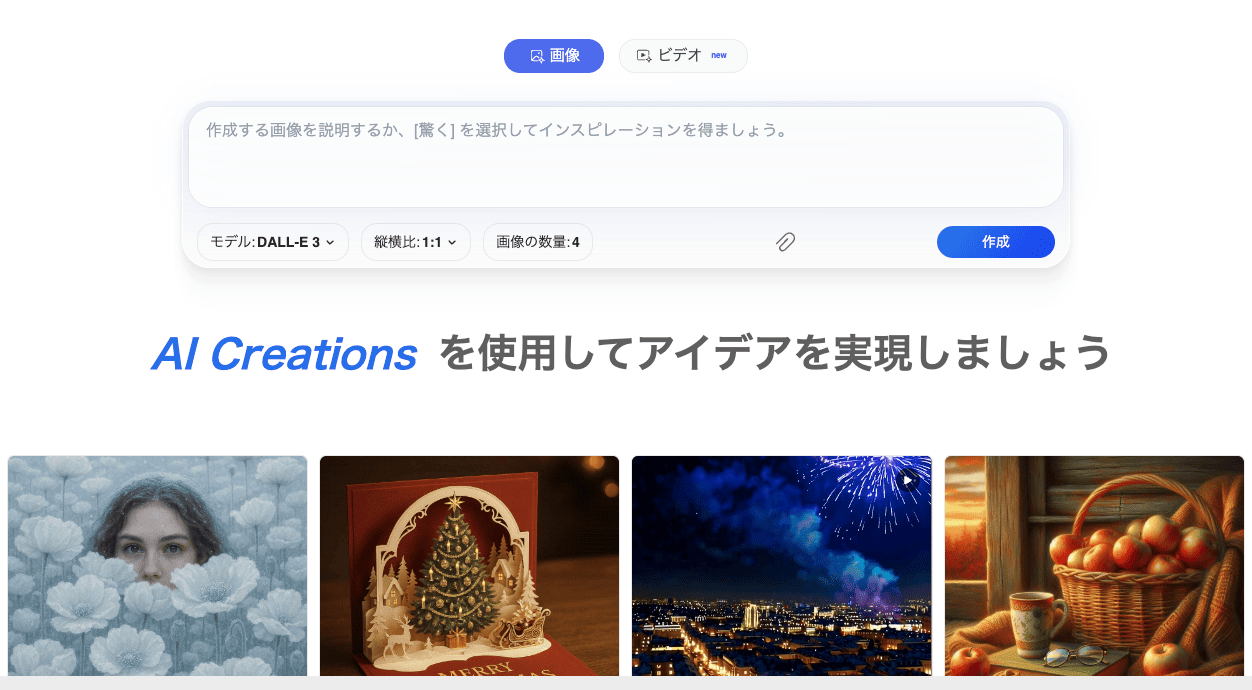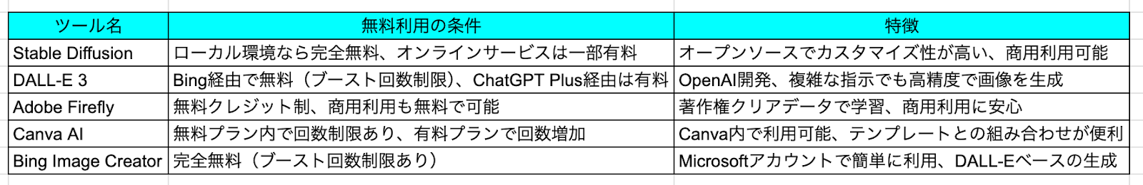 これまで専門的なスキルが必要だった画像作成が、誰でも簡単に行えるようになりました。まずは、代表的なツールとその特徴 を押さえておきましょう。