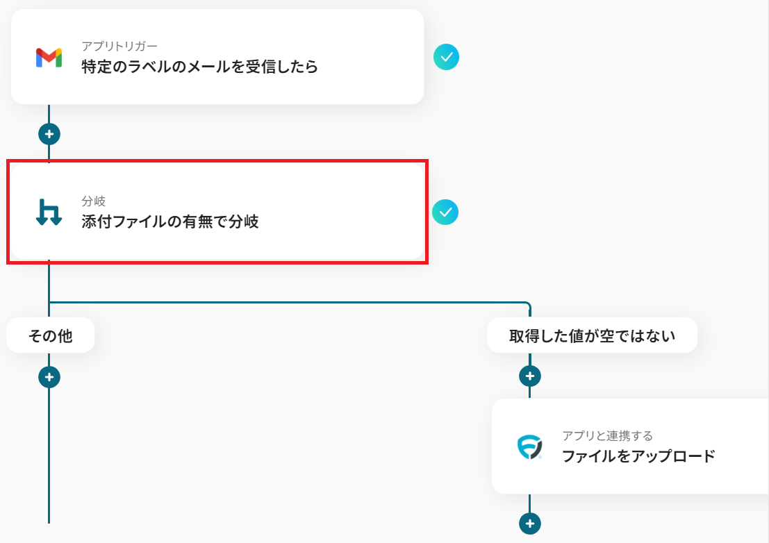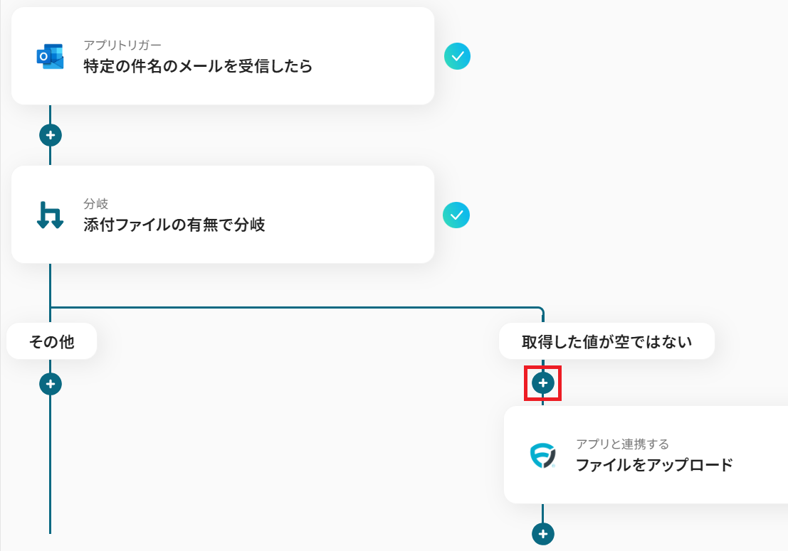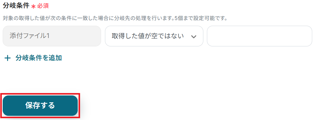 - 続けて、オペレーションで分岐機能を設定し、添付ファイルの有無に応じて後続の処理を分岐させます。