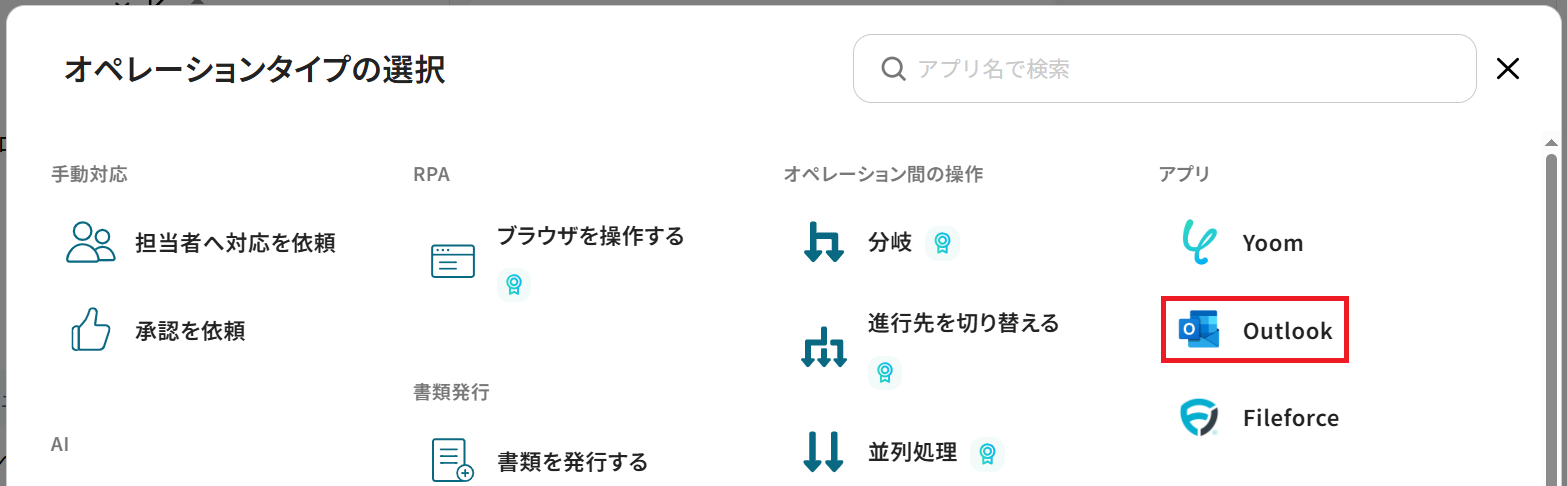 - はじめに、FileforceとOutlookをYoomと連携します