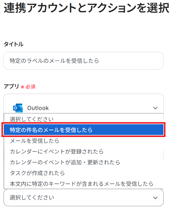1.ステップ3の連携アカウントとアクションを選択する画面で、GmailのトリガーをOutlookの「特定の件名のメールを受信したら」などに変更