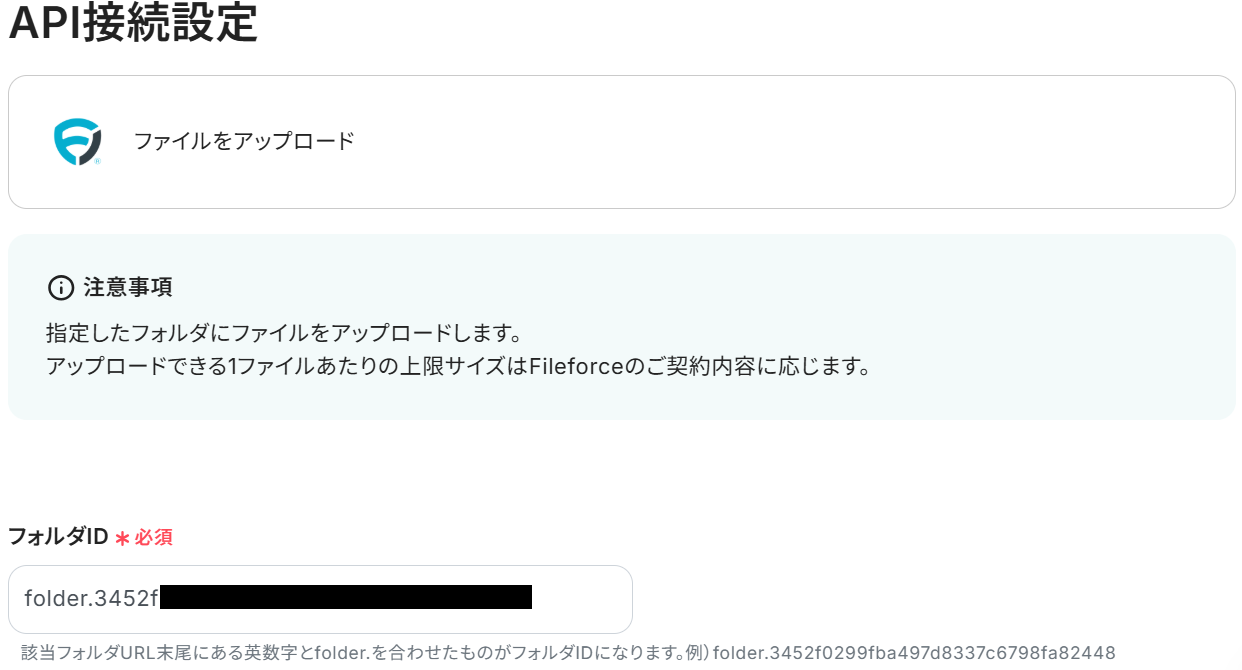 - Fileforceのファイルアップロード設定では、アップロード先のフォルダIDやファイル名などを任意に設定できます