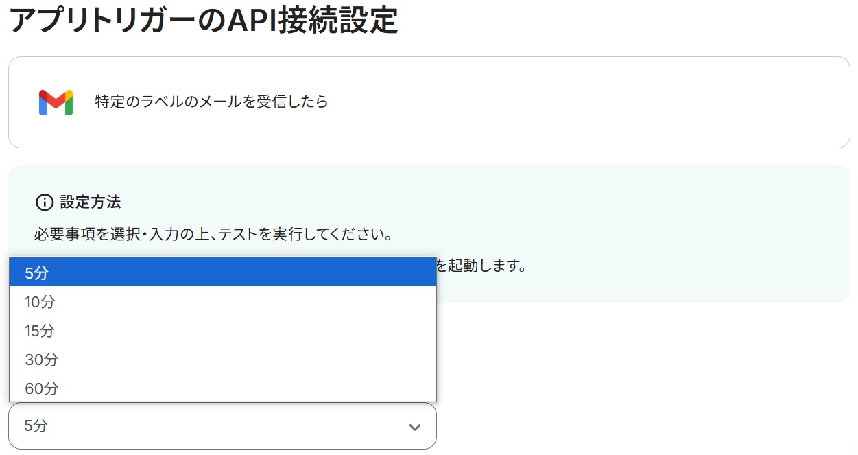 - トリガーは5分、10分、15分、30分、60分の間隔で起動間隔を選択できます。
