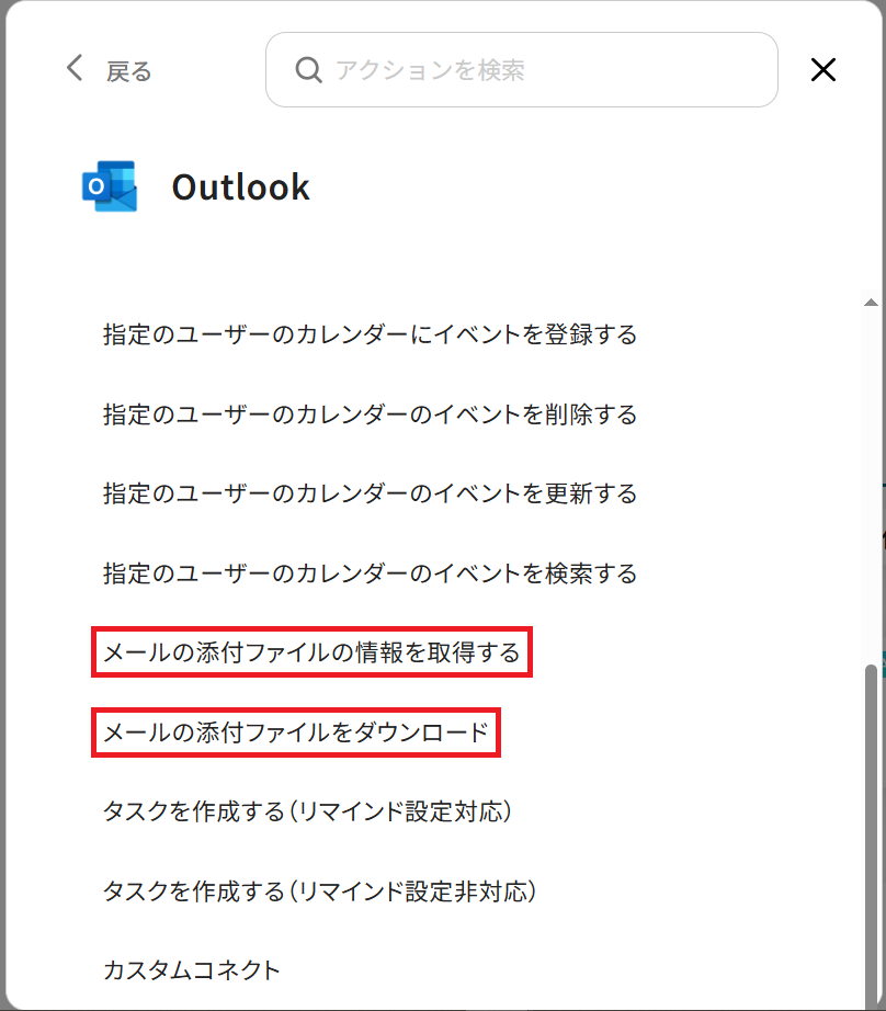 2.ステップ4の下にOutlookの「メールの添付ファイルの情報を取得する」と「メールの添付ファイルをダウンロード」アクションを順番に追加