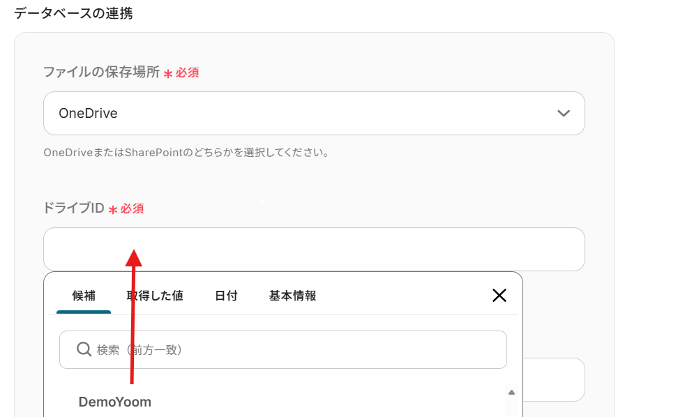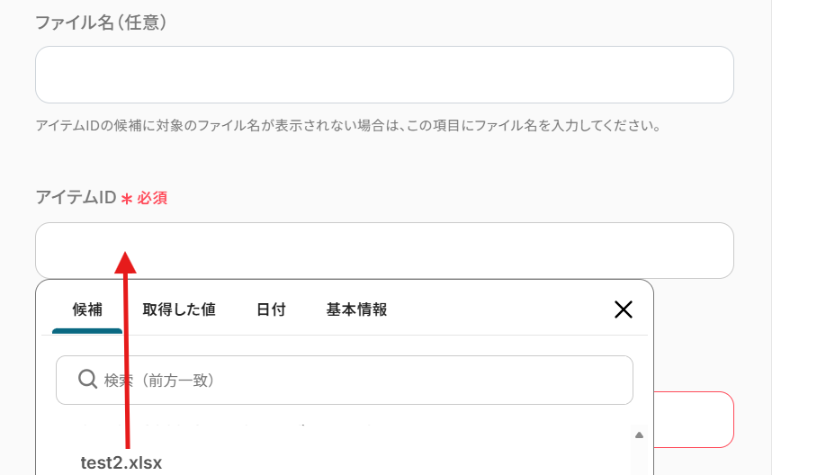 入力バーをクリックすると、以下の画像のように『候補』に連携したアカウントに基づいたIDが表示されます。
