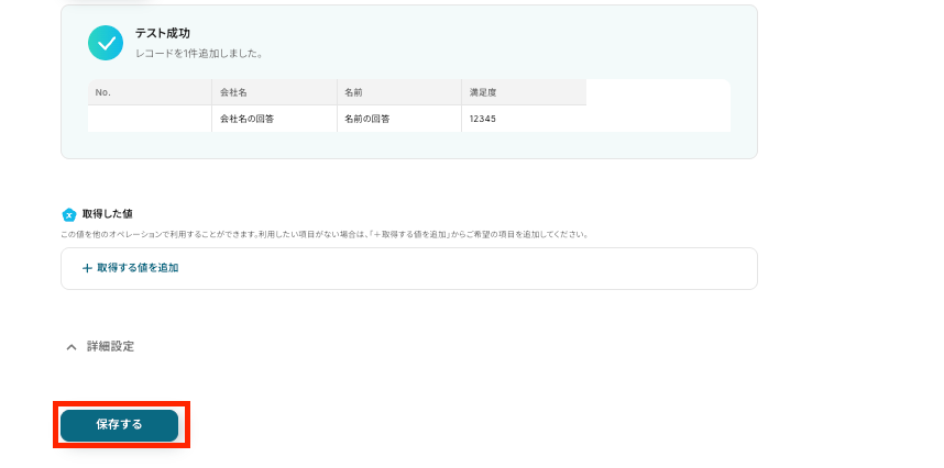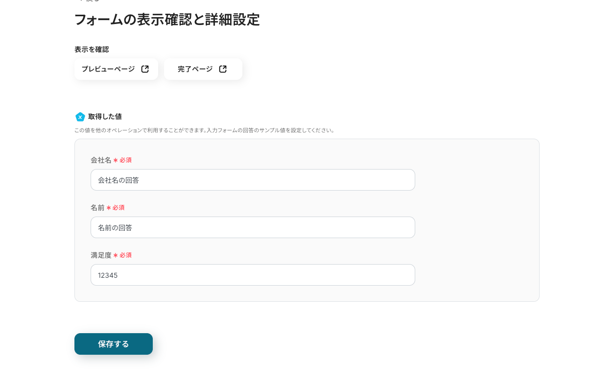 次の画面で、テストとして回答内容のテストデータを入力して、[保存する]をクリックしてください。 このページで実際のフォームのプレビュー・完了ページを確認できるので、希望の内容に沿ったフォームとなっているかを確認するのを忘れずに! ※取得した値 とは?