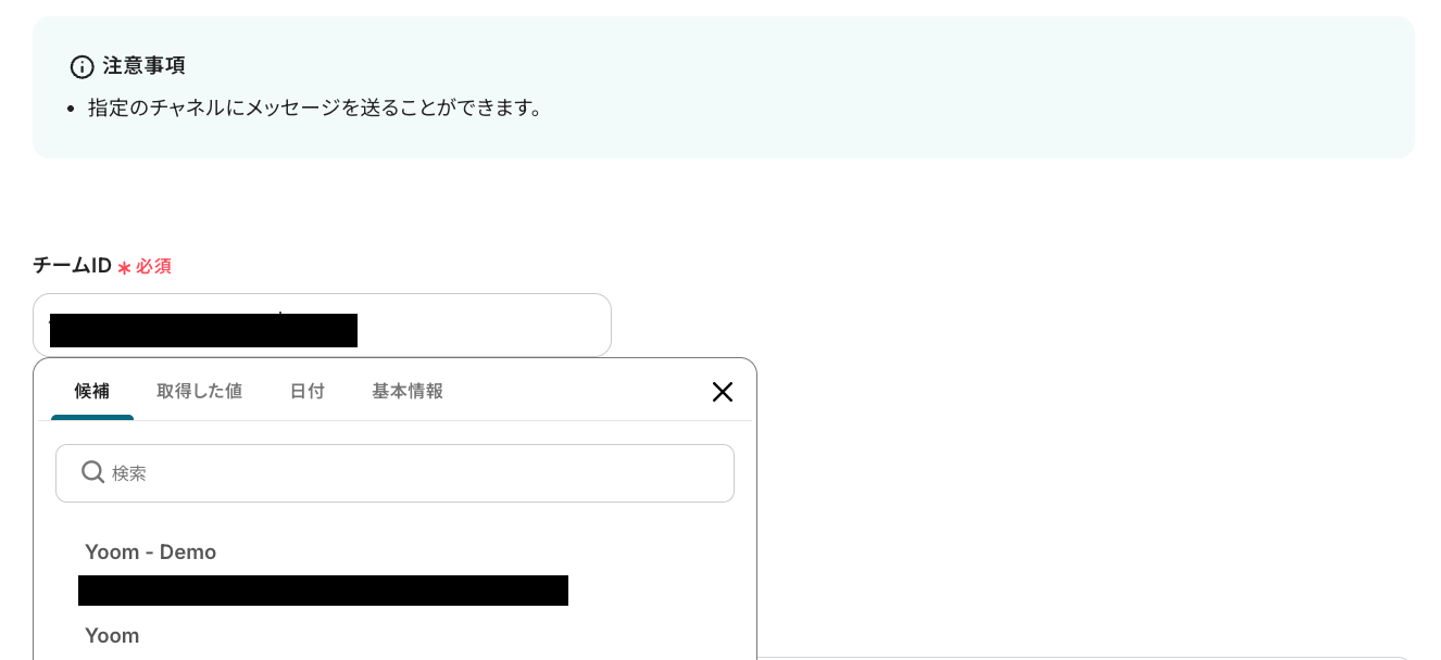 こちらの画面ではMicrosoft TeamsのチームIDとチャネルIDを選択し、自動送信されるメッセージの内容を編集することができます。 入力バーをクリックすると、連携したアカウントに基づいた内容が「候補」として展開されますので、「チームID」と「チャネルID」をそれぞれ選択してください。