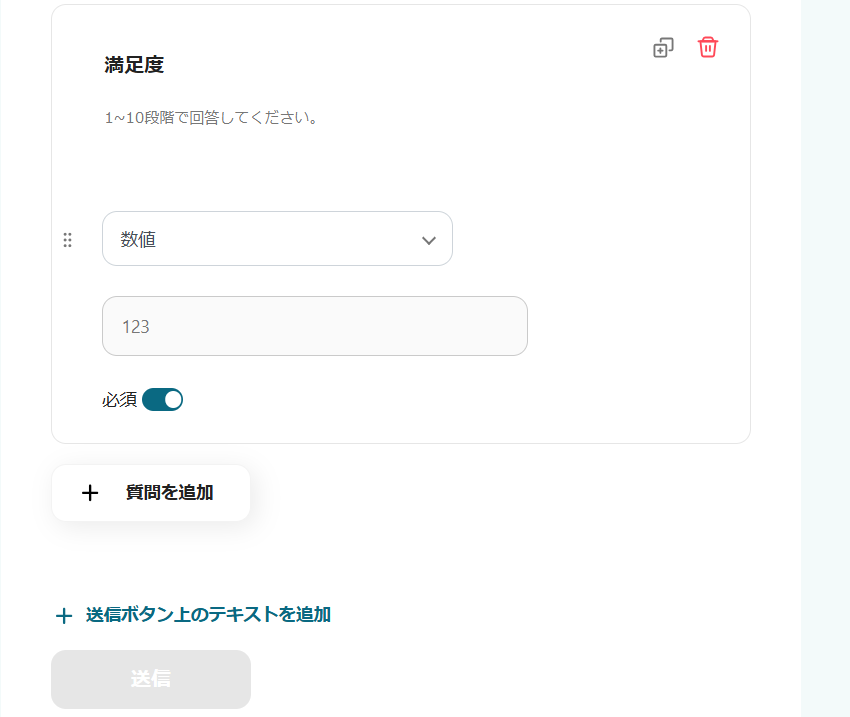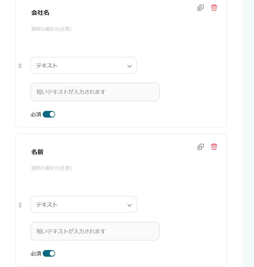 すでに設定されている項目を編集したい場合、「必須」トグルのON/OFFや【+質問を追加】など、カスタム可能な項目が複数あるため、下記のページを確認して編集を試してみてください。