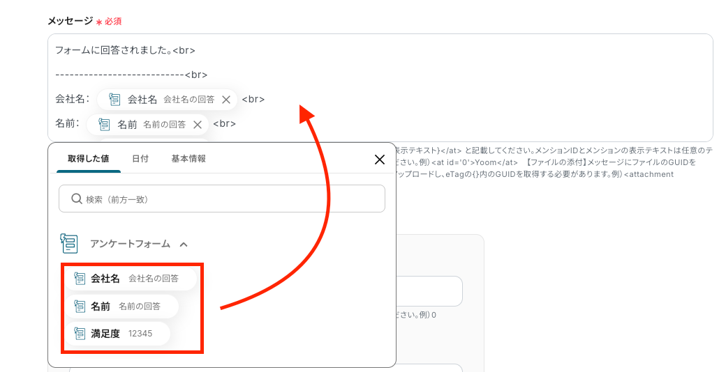 「メッセージ」には、通知内容に含めたい情報を入力していきます。 入力バーをクリックすると、取得した値を引用できます。 以下の画像は例として、前ステップで取得した取得した値を入力し設定したものです。