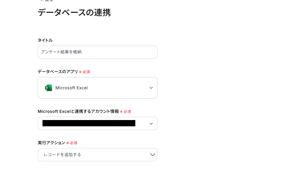 「タイトル」は任意で編集が可能です。 「Microsoft Excelと連携するアカウント情報」にて、正しいアカウントが選択されているか確認をしてください。 複数のアカウントを所有している場合、別のアカウントが選択されていることがあります。 アクションは変更せずに「次へ」を押し、先へ進みましょう。