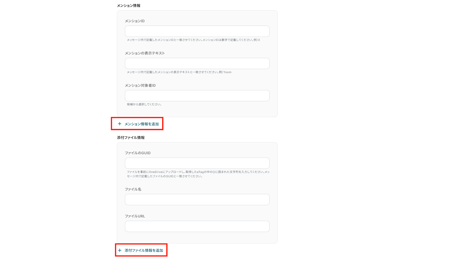 「メンション情報」や「添付ファイル情報」は運用状況に合わせて設定してください。 「+ 〇〇を追加」をクリックすると、設定項目を増やすことができます。
