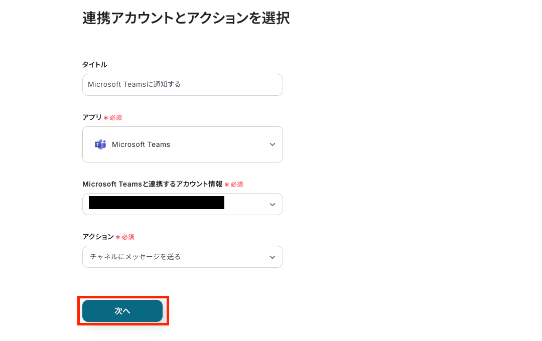 「タイトル」は任意で編集できます。 「Microsoft Teamsと連携するアカウント情報」が、正しいアカウントが選択されているか確認をしてください。 複数のアカウントを所有している場合、別のアカウントが選択されていることがあります。 アクションは変更せずに「次へ」を押し、先へ進みましょう。