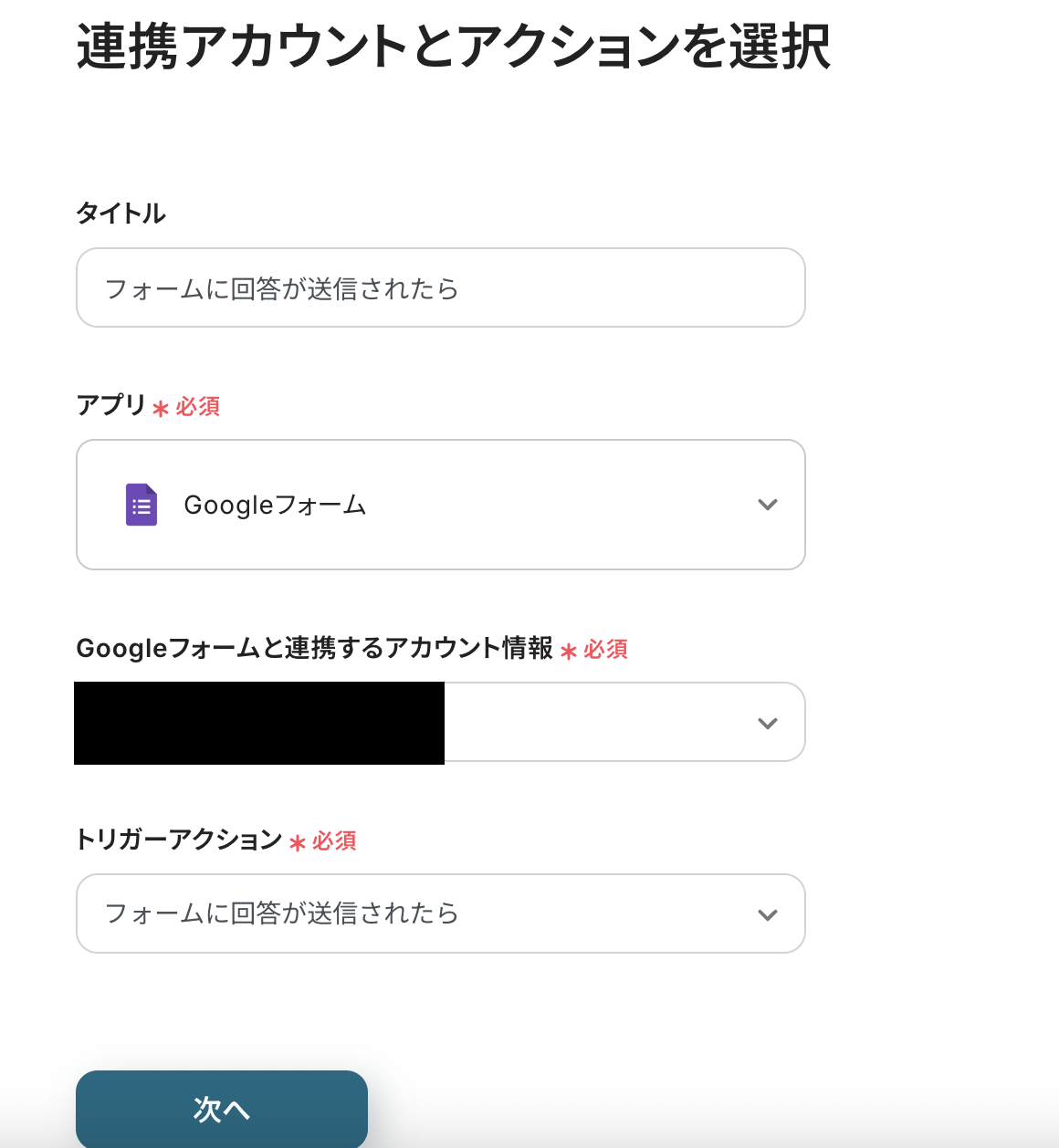 連携アカウントとアクションを選択の画面は設定ができていますので、以下の点を確認し、次へをクリックしてください。