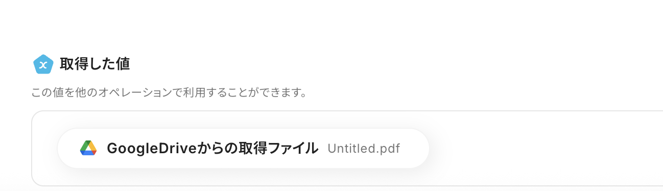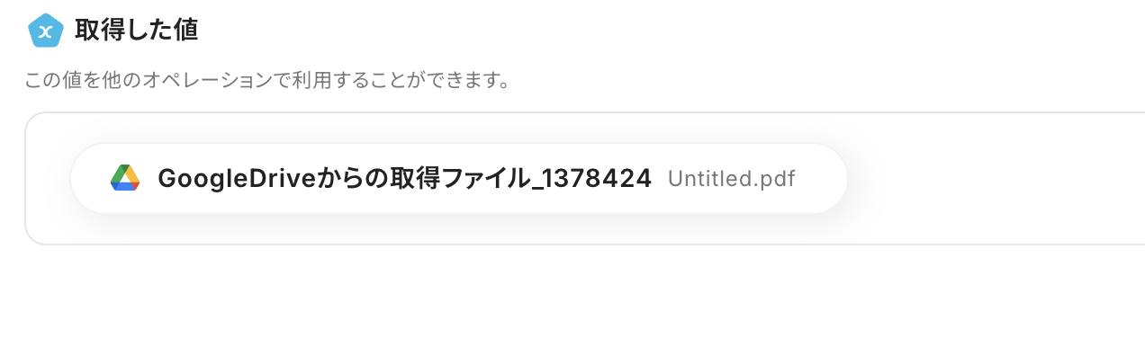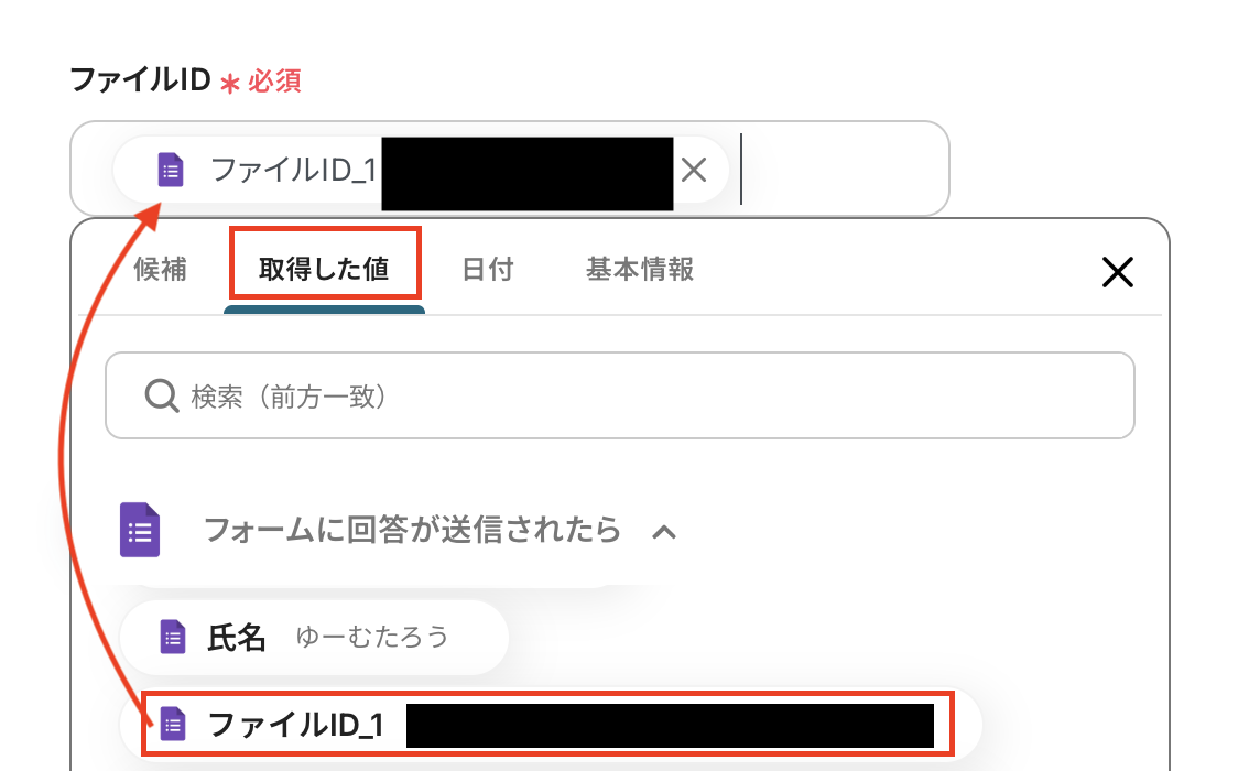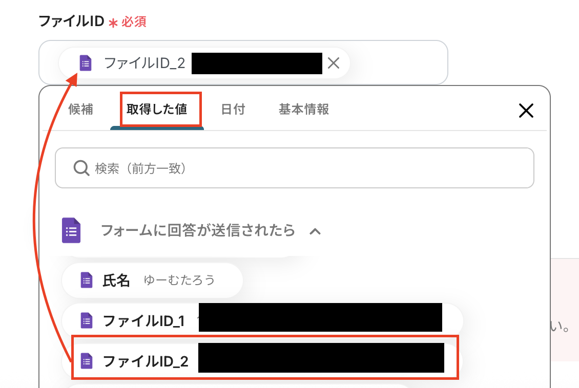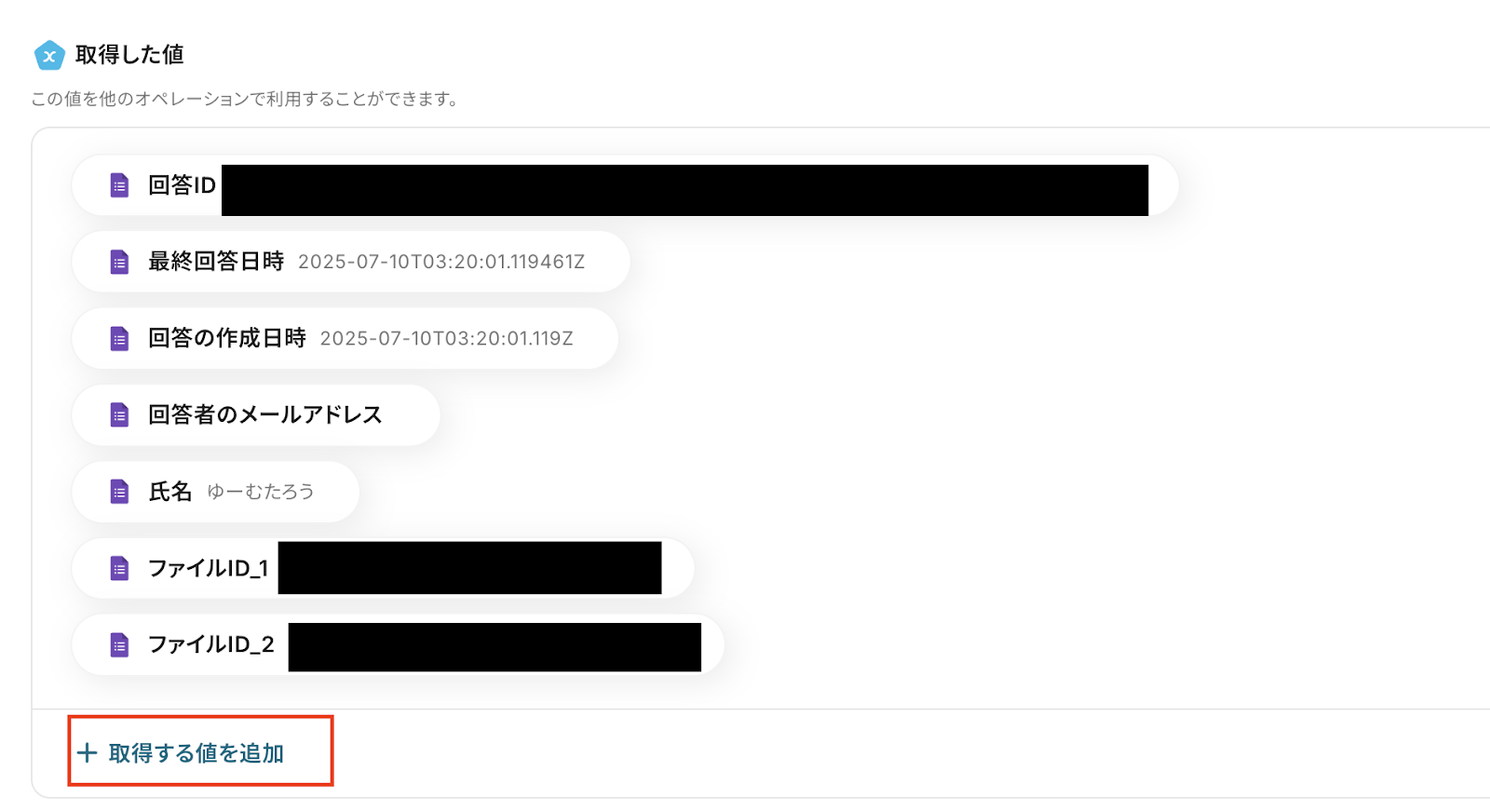 テストが成功したら、「+取得する値を追加」をクリックして、ファイルIDを手動で取得した値(アウトプット)に追加します。