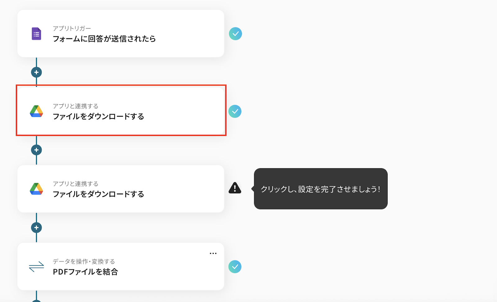 Googleフォームで受け取った複数のPDFファイルを手作業で一つにまとめる作業は、時間がかかり面倒ではありませんか。このワークフローは、Googleフォームへの回答送信をきっかけに、複数のPDFファイルを自動でダウンロードし、1つのファイルに結合して、指定の宛先にGmailで送信します。面倒な手作業から解放され、資料や申請書類などの取りまとめを効率化します。